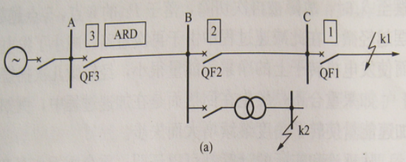 无论是线路末端K1短路,还是其他线路任一点K2 短路,A的过流保护都可以瞬时切除故障。如果是瞬时性故障,A断路器重合后立即恢复供电。如果是永久性故障,重合后A/B/C断路器过流保护再按照整定时间动作。
