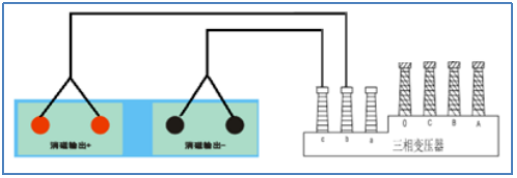 仪器侧接地线接地,输出线对应接好;将消磁仪的红黑测试夹钳夹在低压侧的任意两个绕组上如bc或ab,其余绕组悬空(从原理上来说消磁只需一次就可达到效果,如需重复消磁待第一次消磁结束后将夹子换到另外两相进行试验)。
