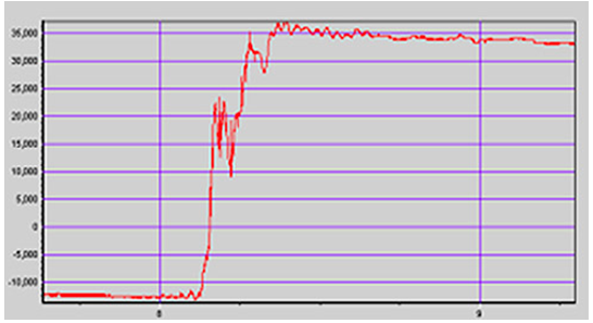 使用了时间拉伸技术,经过放大可以显示出明显的“陡波前”形状。经过计算,表明了du/dt超过285kV/s。因为时间轴的大幅度拉伸,A相和B相的电压曲线距离较远,图上看不到了。