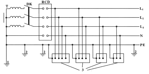 1—工作接地;2—PE线重复接地;3一电气设备金属外壳(正常不带电的外露可导电部分);L1、L2、L3—相线;N—工作零线;PE—保护零线;DK—总电源隔离开关;RCD—总漏电保护器(兼有短路、过载、漏电保护功能的漏电断路器);T—变压器