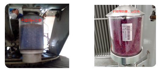 变压器吸湿器内的干燥剂是硅胶,硅胶的正常颜色为蓝色,吸潮后变为粉色或白色,干燥剂呈粉红色或白色,表示干燥剂已经吸入足够的水份就处于饱和状态,若不及时更换干燥剂造成变压器油受潮、变质、绝缘下降,导致变压器发热。